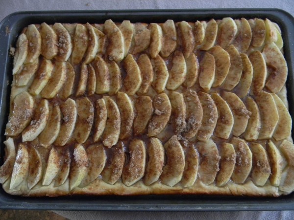 This is an apple coffee cake that was made by my German mother-in-law. It has a yeast dough base and is topped with sliced apples. My mother-in-law also used sliced plums on top of the cake in place of the apples when the plums were in season.