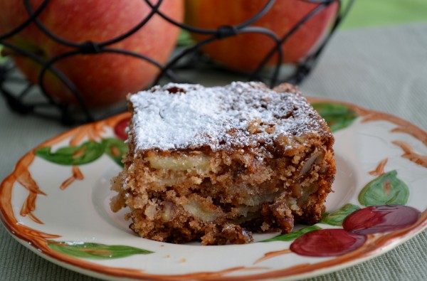 Nothing is better in the fall and winter than the smell of apples cooking in the oven. When baking apples I like to use a variety that maintains its shape such as Golden Delicious, Jonagold, Granny Smith, or Braeburn. This recipe takes advantage of that characteristic with slices of apple in the cake.