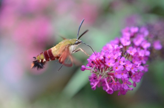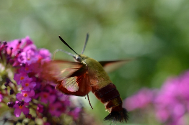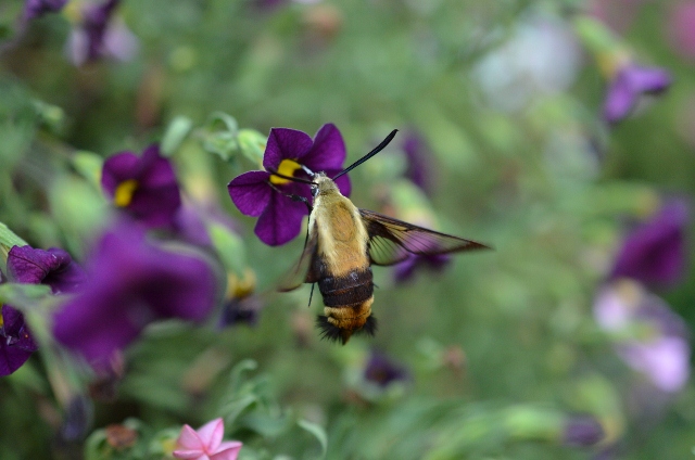 The hummingbird moth, so named because of its resemblance to a hummingbird, is a moth that is constantly on the move with wings that beat very fast. It is hard to get a clear picture because of the moving wings and constant motion of the moth but it is fun to watch as it moves among the flowers.