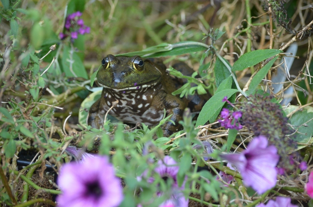As I was walking by the flowers this afternoon, I looked up at a basket of petunias and came face-to-face with a very large frog who was enjoying his (or her) time in the basket. Being startled, I jumped a foot in the air but then I decide that it was a pretty interesting visitor to have sitting in the flowers—much better than a snake!