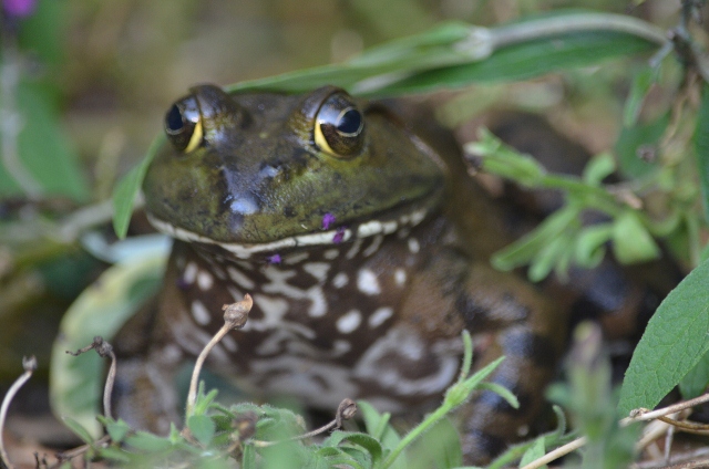Does the frog have some purple flower bits stuck to his face?! very cool!