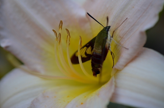 The hummingbird moths were plentiful this summer, although they are disappearing now that the cooler weather is approaching. Here is one visiting a day lily that was actually still for a few moments.