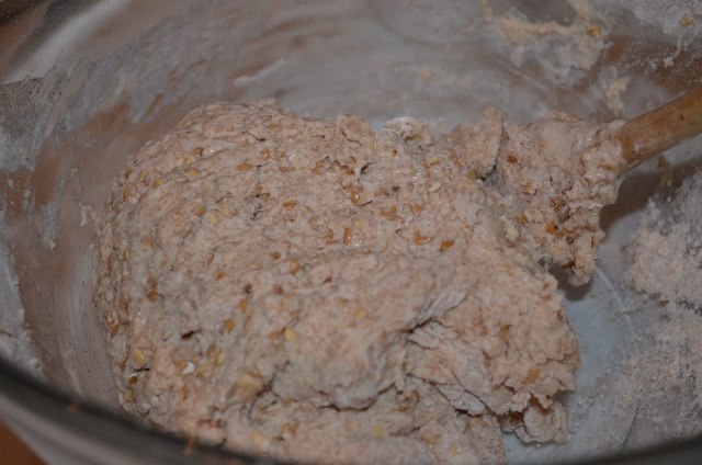 Whisk the flour, salt and yeast together. Add the oats and flax seeds. Add water and vinegar and mix into a moist dough.