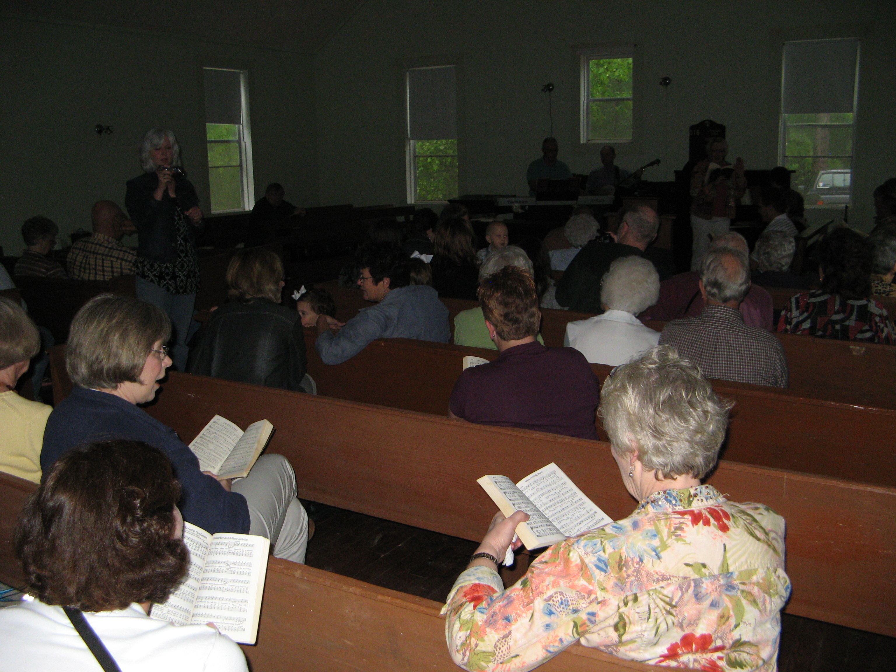 singingHomecoming is when when the families gather once again at the little country church. The morning is spent singing the old southern gospel songs, I’ll Fly Away, Victory in Jesus, Camping in Canaan’s Land, Never Grow Old, I’d Rather be an Old Time Christian, etc. In addition to the old upright piano, recent years have seen the addition of guitars for the singing.