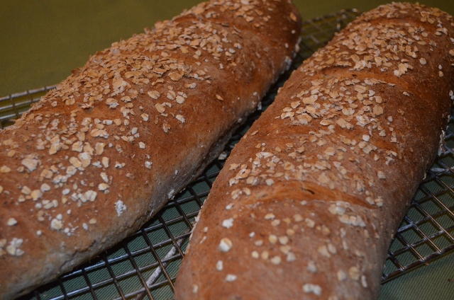 5. Sprinkle oatmeal on a surface. Spray each dough log with non-stick spray and roll in oats to coat. Using a sharp knife make several cuts on the top of each loaf. Place on a cookie sheet. Cover and let rise a second time – approximately one hour.