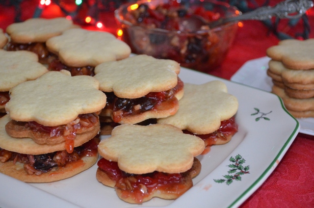 This is a recipe that one of my cousins developed when she was in high school. She won a national cooking contest with the recipe and as I remember the prize was a new stove. The recipe uses a filling similar to the Lady Baltimore Cake between two buttery cookies. I usually cut the recipe in half as the cookies very sweet and a little goes a long way.