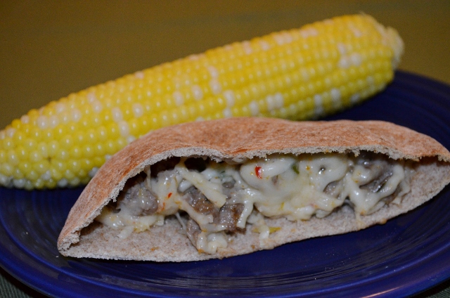 2. Cut pita bread in half. Stuff with warm filling. Sprinkle with cheese
