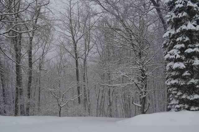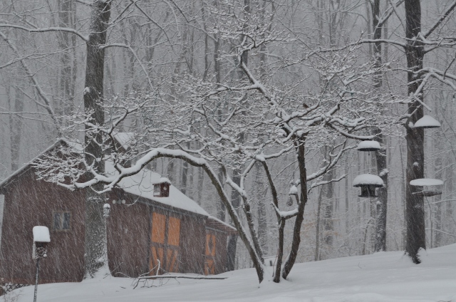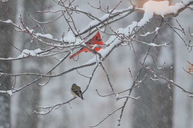 Here are some photographs from our snowfall yesterday. The photo above includes a white throat sparrow, dark eyed junco, goldfinch and female cardinal – four different birds all sitting on same branch in the snow. While the temperature is in the single digits today, hopefully warmer weather and spring will be here soon.