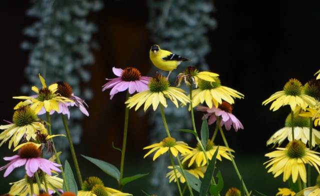 I am enjoying our summer flowers and birds today. I love the summer plumage of the goldfinch and the scene as he stops by to eat some seeds from the cone flowers. (The silver/gray in the back of the photo is Dichondra (silver falls) from a hanging basket in a tree — Dichondra makes a great “spiller” for a hanging basket).